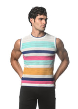 Teal and flamingo horizontal stripe textured knitted vest with a tapered fit. Featuring a crew neck, a sleeveless design, ribbed straight hem and armhole and fully fashioned knitted body. Made from a super lightweight cotton acrylic yarn blend with vertical rows of knit stripes.